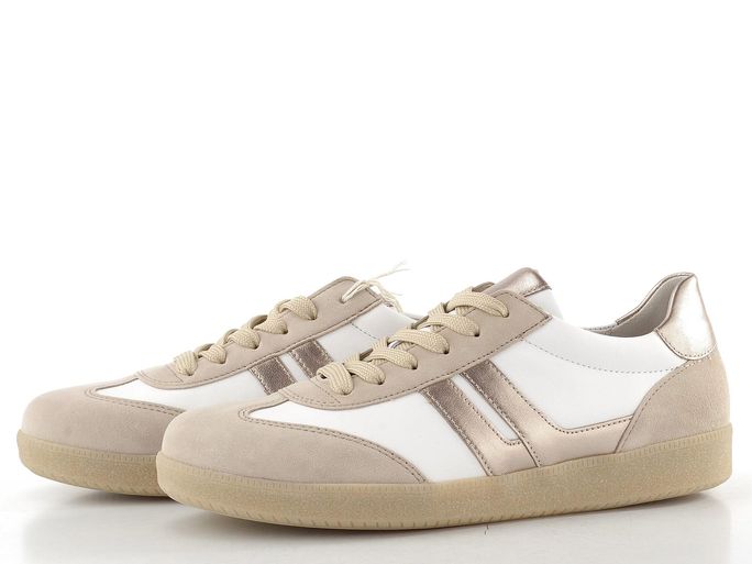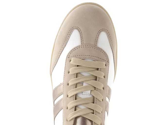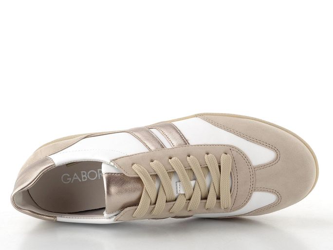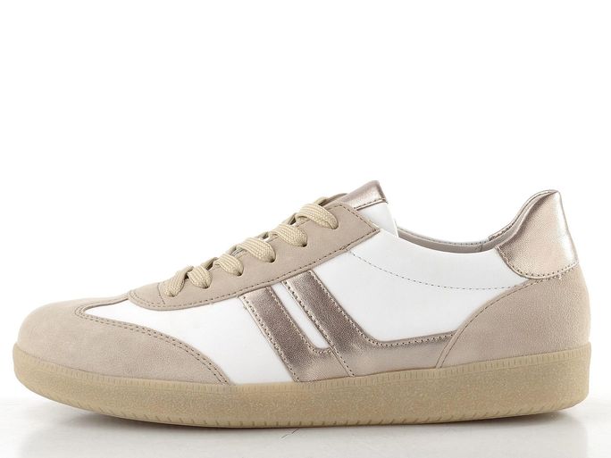 Dámské kožené tenisky od značky Gabor představují ideální volbu pro jarní a letní dny. S elegantním ležérním stylem a kombinací broušené, hladké a metalické kůže se skvěle přizpůsobí každému outfitu. Kulatý střih špičky a klasické šněrování s plochými tkanicemi zajistí pohodlné nošení po celý den.