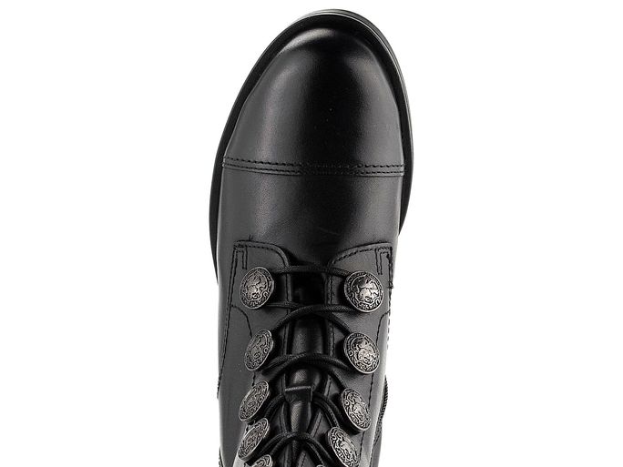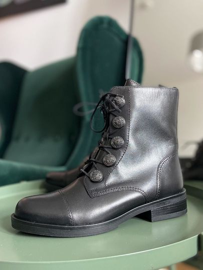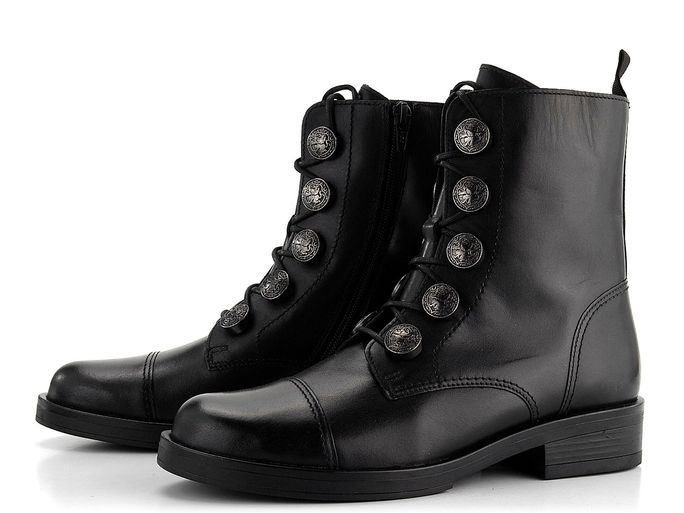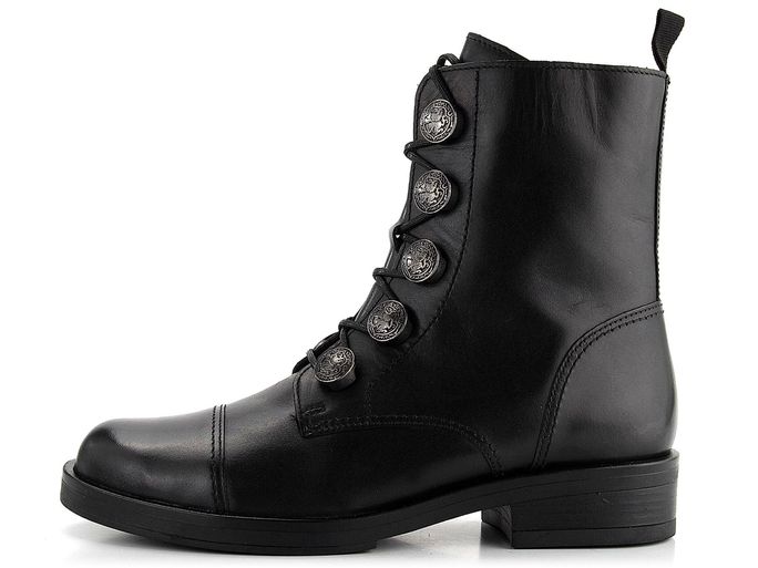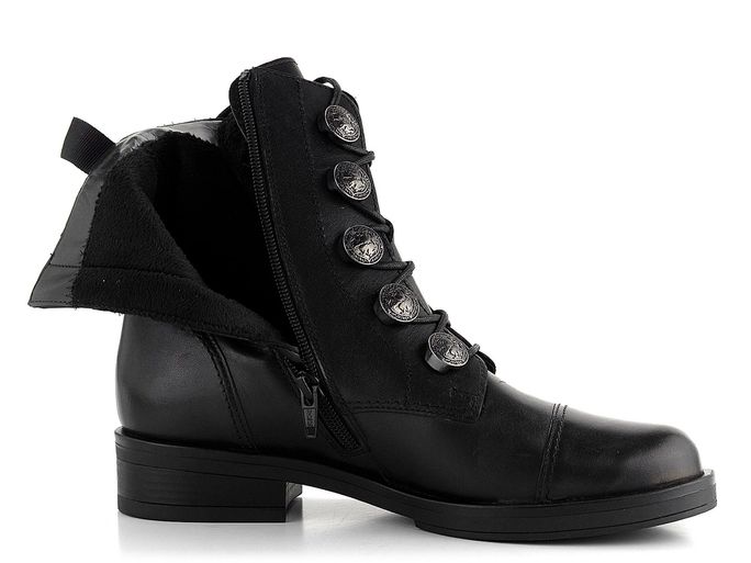 Design obuvi je podtržen dominantními kovovými gravírovanými poutky ve tvaru knoflíků a polstrovaným jazykem, což dodává botám jedinečný vzhled. Vnitřní podšívka z hebké vlasové textilie zajistí teplo i v chladnějších dnech. Kvalitní latexová podešev se širokým podpatkem o výšce 3,5 cm poskytuje stabilitu a pohodlí při chůzi.