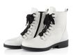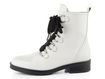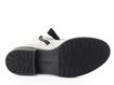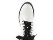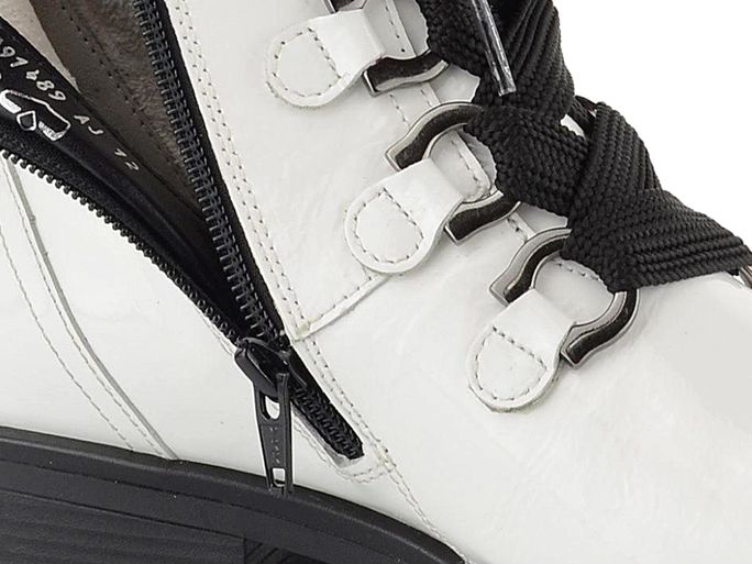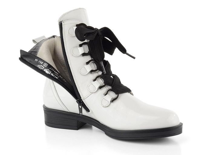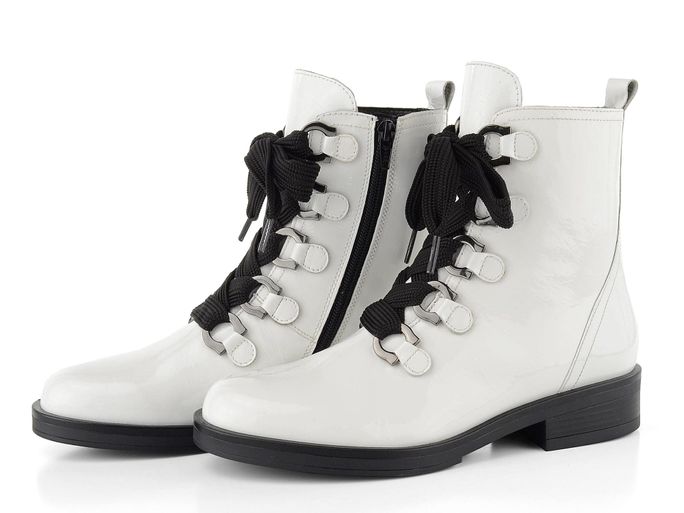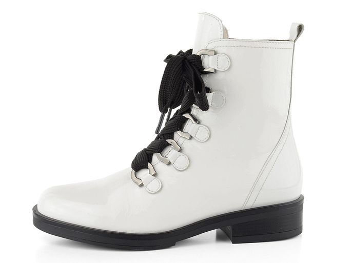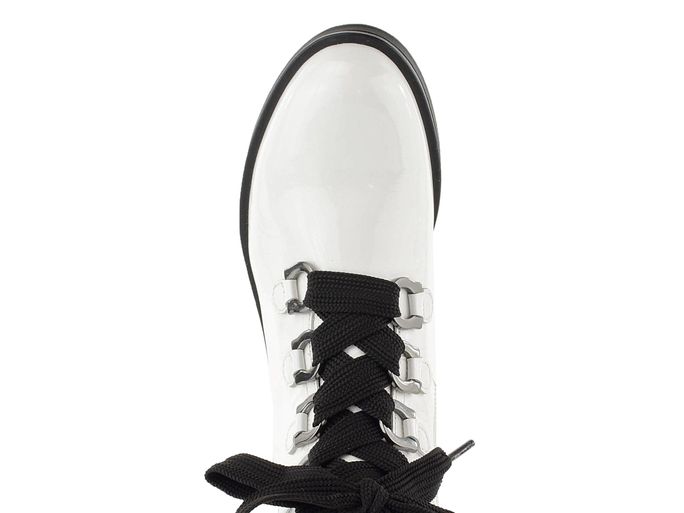 Nevšední dámský nevyteplený kotník v bílém lakovaném provedení s černými doplňky.