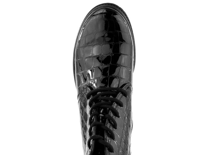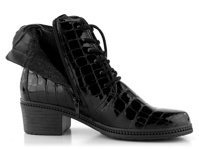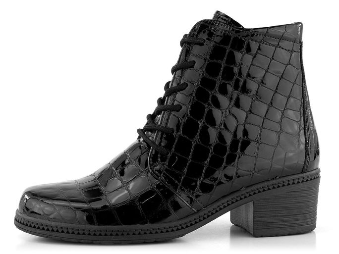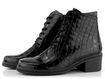 Dámský vyteplený šněrovací kotník v lakovaném provedení a na středně vysokém, stabilním podpatku.