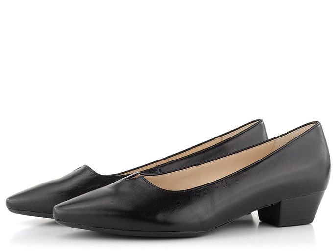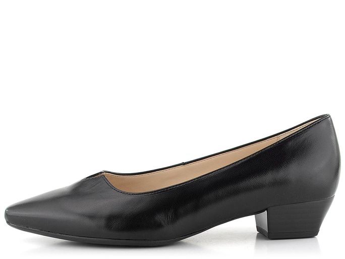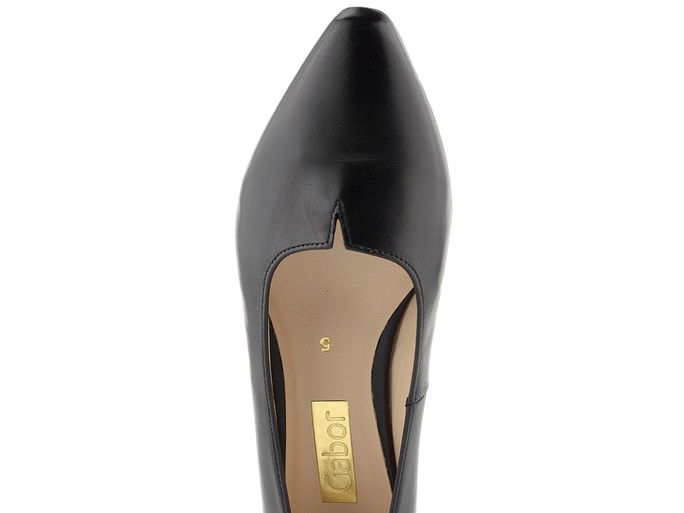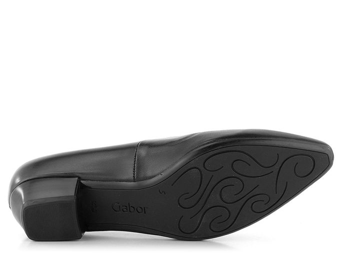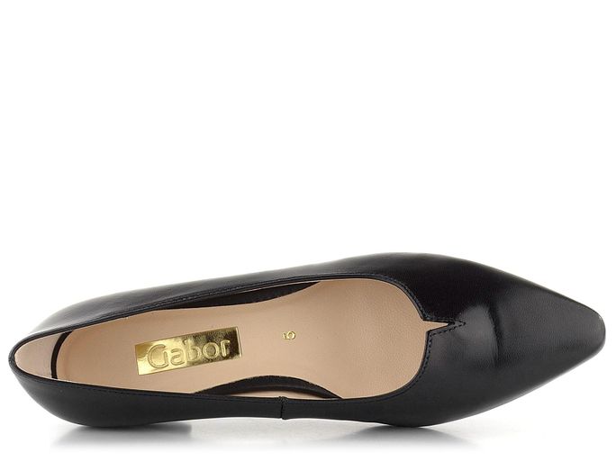 Dámské luxusní lodičky od světoznámé značky Gabor jsou skvělou volbou pro každou ženu, která hledá eleganci a pohodlí v jednom. Tyto lodičky mají elegantní špičatý střih, který dokonale padne na nohu a dodá jí sofistikovaný vzhled. Svršek je vyroben z hladké kůže, která zajišťuje dlouhou životnost a snadnou údržbu. Klasická černá barva se hodí ke každému outfitu, ať už do kanceláře, na formální příležitost nebo na lehkou procházku městem.