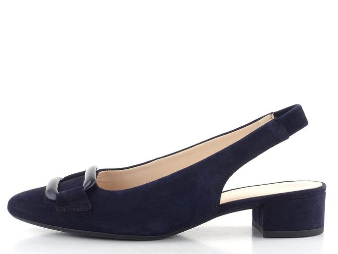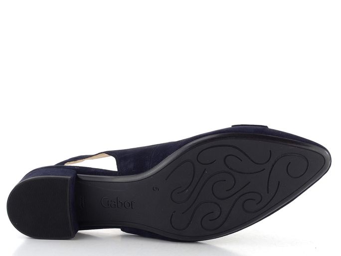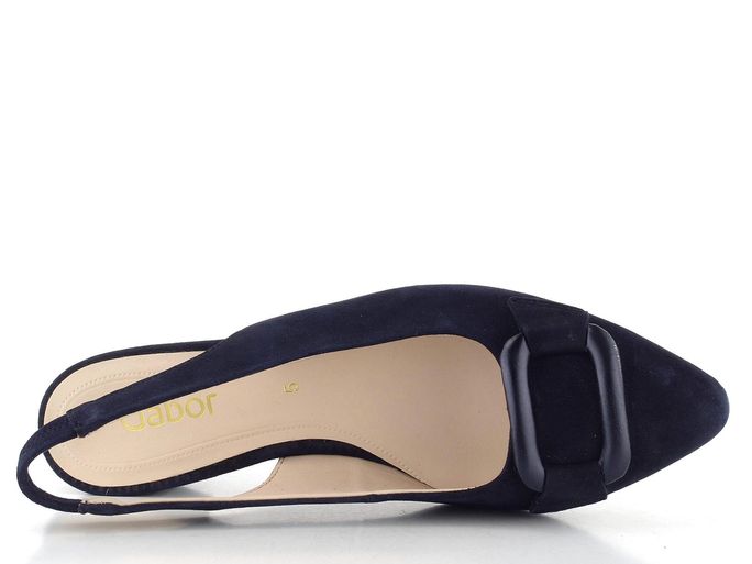 Elegantní dámské lodičky s volnou patou od značky Gabor představují ideální volbu pro ty, kteří hledají kombinaci stylu a pohodlí. Tyto lodičky vynikají temně modrým odstínem a semišovým svrškem, který dodává botám luxusní vzhled. Ozdobná spona na špičce přidává na sofistikovanosti, zatímco patní pásek s pruženkou zajišťuje pohodlné nošení. Vnitřek z celokoženého materiálu je poddajný a příjemný, což spolu s měkčenou nášlapnou stélkou zaručuje komfort při každém kroku. Stabilní podpatek o výšce 3,7 cm a syntetická podešev s jemným vzorkem poskytují jistotu a eleganci při každé příležitosti.