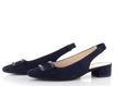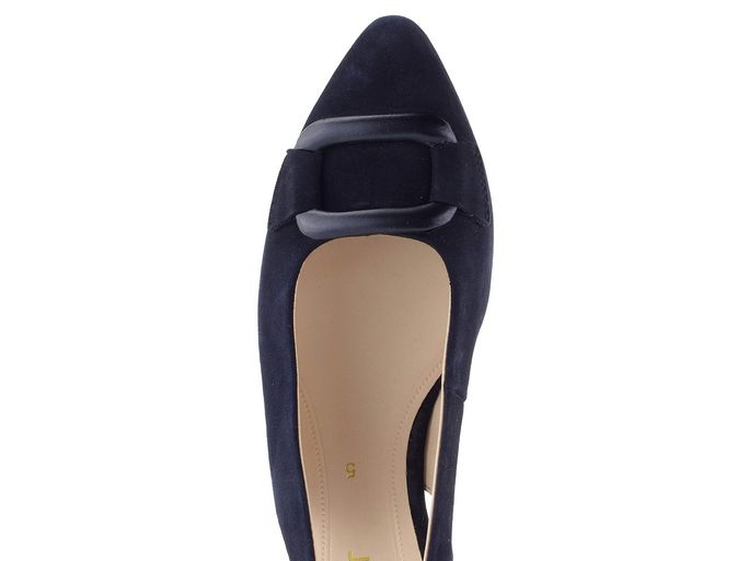 Dámské semišové lodičky v elegantním střihu s volnou patou, v tmavě modrém odstínu a s ozdobnou sponou.