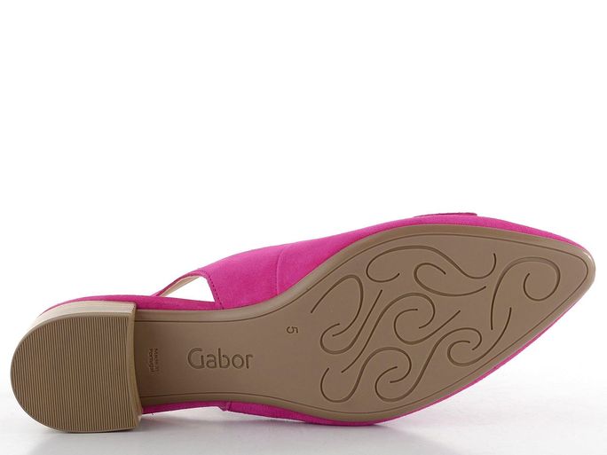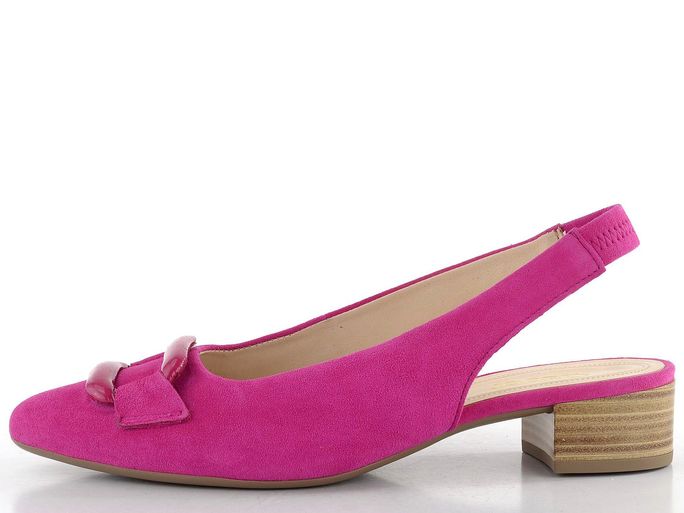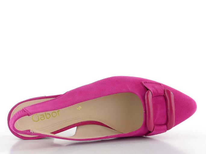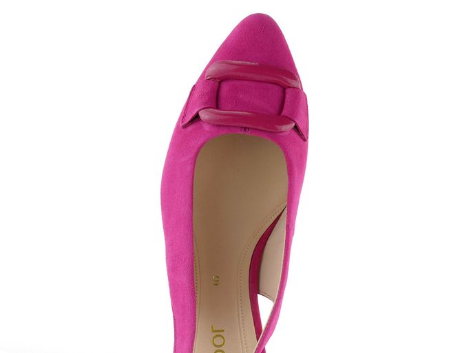 Elegantní dámské lodičky s volnou patou od značky Gabor jsou ideální volbou pro ty, kdo hledají spojení stylu a komfortu. Tyto lodičky se pyšní semišovým svrškem v výrazném růžovém odstínu, který zaujme na první pohled. Ozdobná spona z lakované kůže na špičce dodává botám sofistikovaný vzhled. Patní pásek s pruženkou zajišťuje pohodlné nošení, zatímco měkčená nášlapná stélka a celokožený vnitřek poskytují maximální komfort. S nižším stabilním podpatkem o výšce 3,7 cm a syntetickou podešví s jemným vzorkem jsou tyto lodičky ideální pro každodenní nošení do města i do kanceláře.