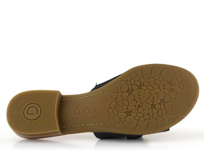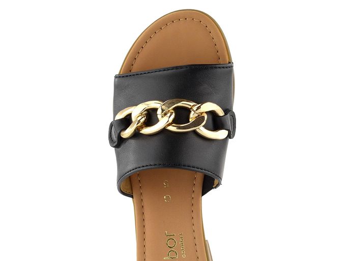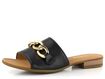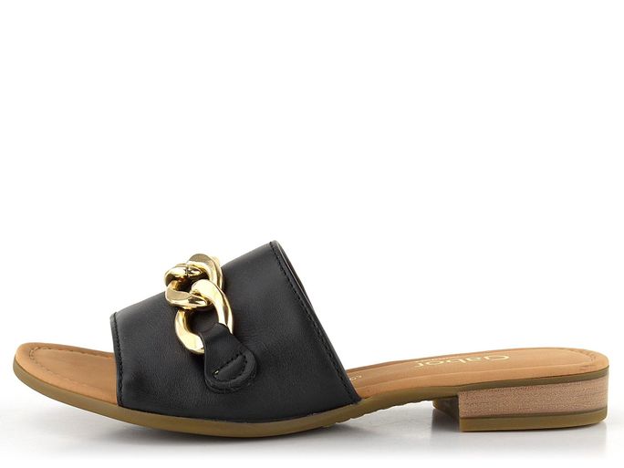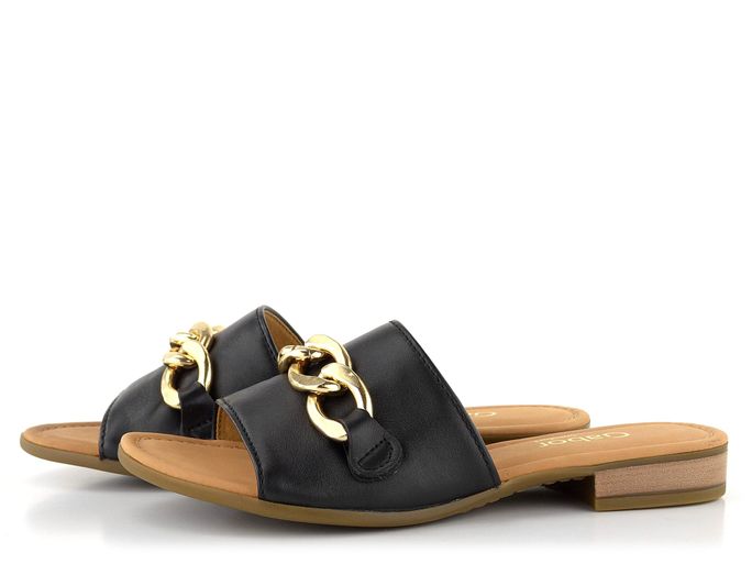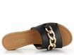 Jednoduché dámské pantofle s výraznou kovovou ozdobou a na širokém nízkém a pohodlném podpatku.
