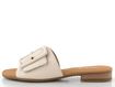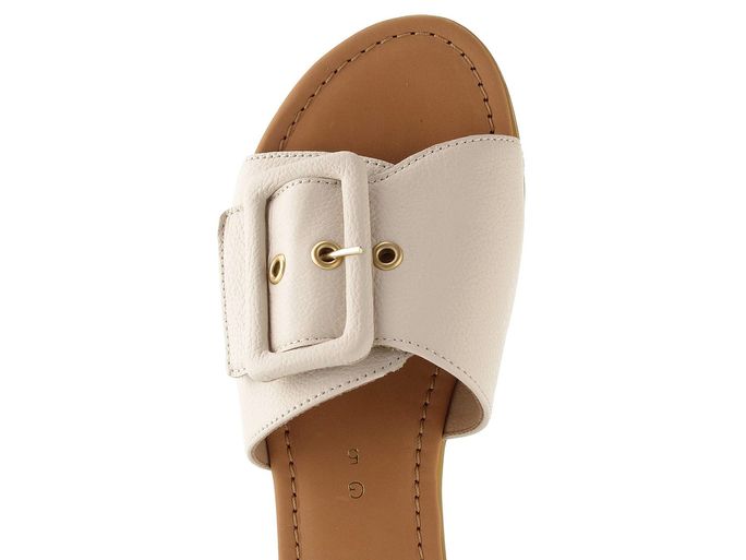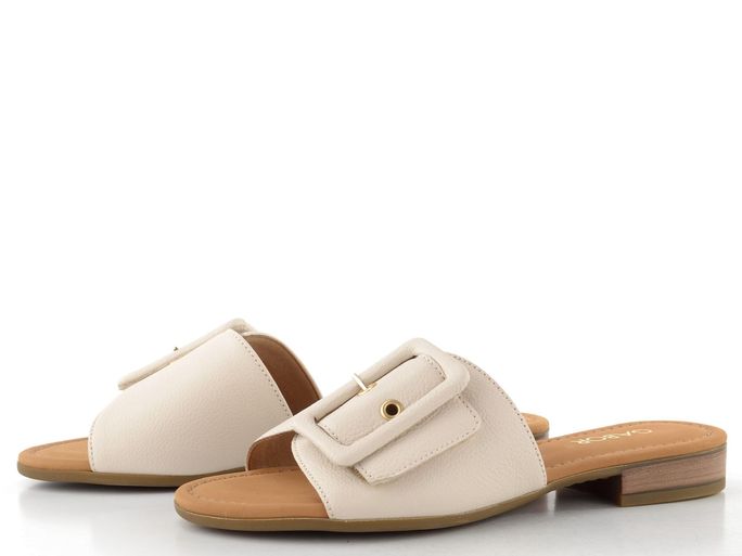 Jednoduché dámské kožené pantofle s výraznou sponou a nízkým podpatečkem.