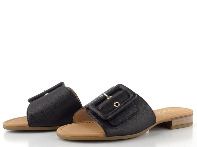 Jednoduché dámské pantofle s výraznou sponou a nízkým pohodlným podpatečkem.