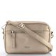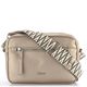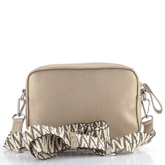 Malá dámská crossbody kabelka v metalické platinové barvě s vyměnitelnými popruhy.
