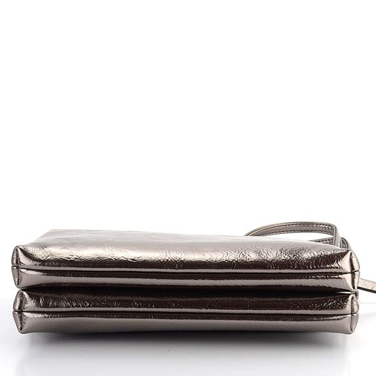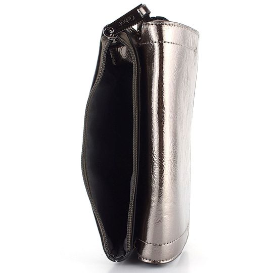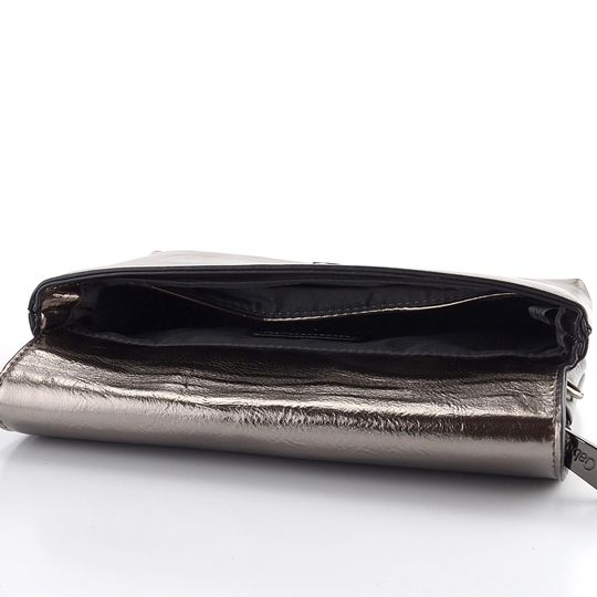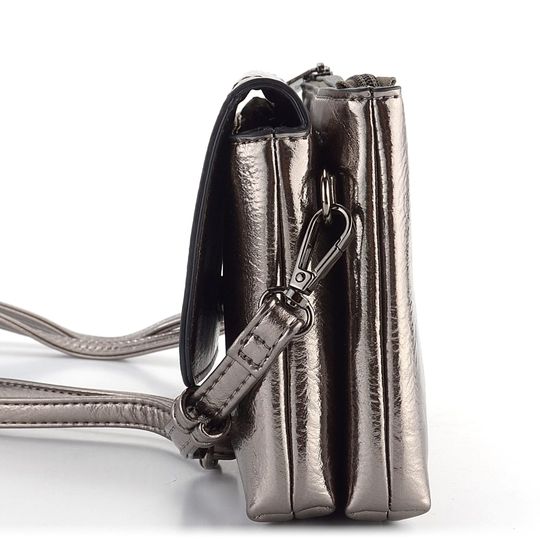 Malá crossbody kabelka ve starostříbrné metalické barvě s klopovou a zipovou kapsou.