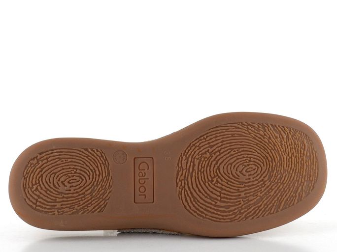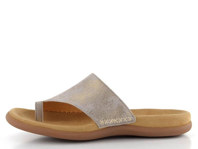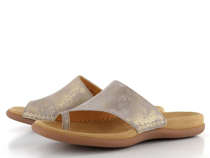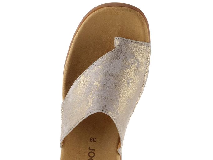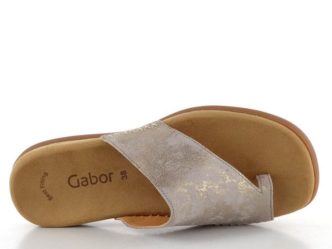 Užijte si komfort a styl s letními žabkami od značky Gabor. Tyto vysoce komfortní páskové boty se pyšní dokonale padnoucím střihem a plochým páskem mezi prsty. Vyrobené ze zabroušené kůže, nabízejí béžový odstín s jemným metalickým bronzovým leskem, který dodá vašemu outfitu šmrnc.