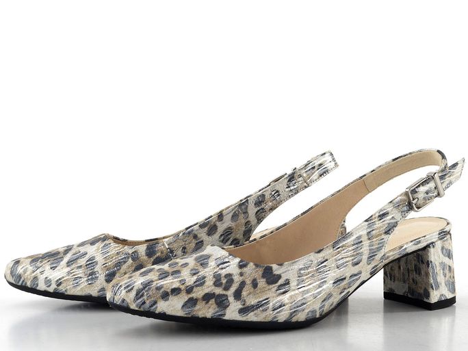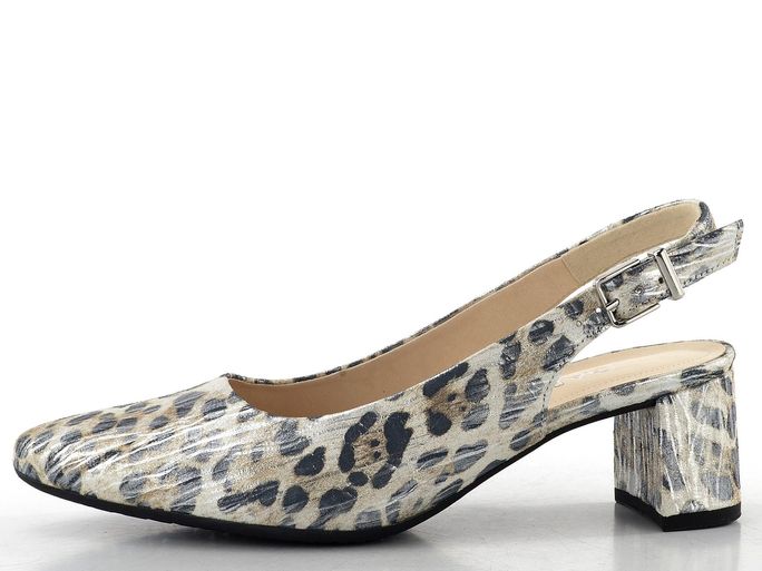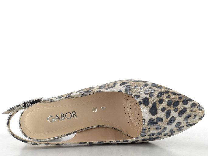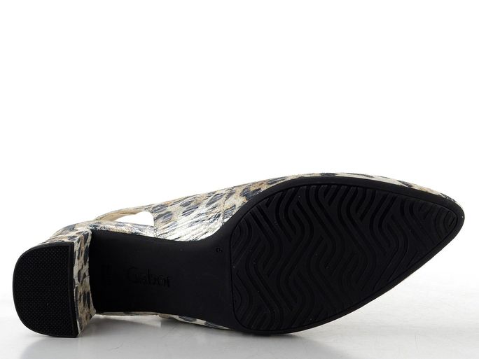 Elegantní dámské lodičky značky Gabor jsou ideální volbou pro jarní a letní dny. Tyto kožené lodičky s volnou patou kombinují komfort a styl díky svému módnímu špičkovému střihu. Svršek z metalické kůže v barevném provedení s hnědo-šedým zvířecím vzorem a stříbrným leskem dodává těmto botám jedinečný vzhled.