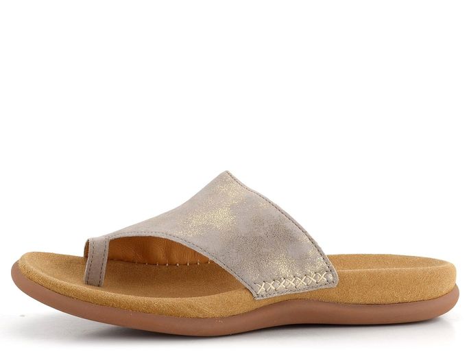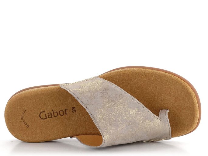 Zažijte pohodlí a styl s těmito komfortními koženými žabkami od značky Gabor. Díky jejich šedobéžové barvě se zlatým metalickým odleskem se stanou elegantním doplňkem vašeho letního outfitu. Pásky mezi prsty jsou navrženy tak, aby dokonale padly a poskytly dostatek prostoru. Svršek je vyroben ze zabroušené kůže, která zajišťuje dlouhou životnost a luxusní vzhled. Podšívka kombinující kůži a textilii zajišťuje maximální pohodlí. Anatomicky tvarovaná stélka potažená textilií, linie Best Fitting®, poskytuje podporu vašim nohám po celý den. Flexibilní latexová podešev a výška podpatku 2,5 cm zaručují pohodlnou chůzi. Vyberte si kvalitu a styl, které vydrží.