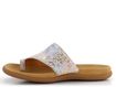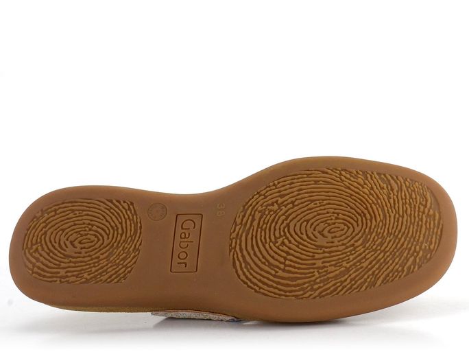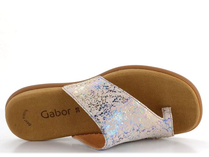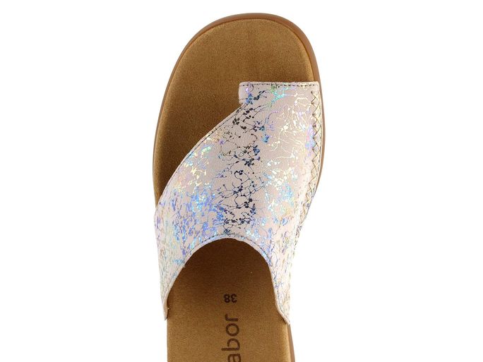 Vysoce komfortní kožené žabky v módním stylu od značky Gabor jsou ideální volbou pro jarní a letní sezónu. Díky prostornému střihu s plochým páskem mezi prsty a světlému pudrovému základu s duhově barevným metalickým potiskem, tyto žabky nejen skvěle vypadají, ale také se pohodlně nosí. Svršek je vyroben ze zabroušené kůže, což zaručuje dlouhou životnost a odolnost. Podšívka na nártu je kožená, zatímco anatomicky tvarovaná stélka potažená textilií poskytuje maximální pohodlí. Flexibilní latexová podešev o výšce podpatku 2,5 cm zajišťuje vynikající stabilitu a komfort při chůzi. Tyto žabky jsou ideální volbou pro každodenní nošení ve městě i na lehkou procházku venku.