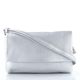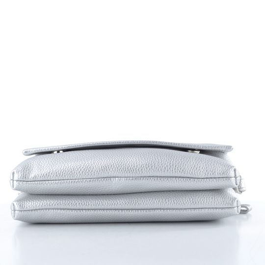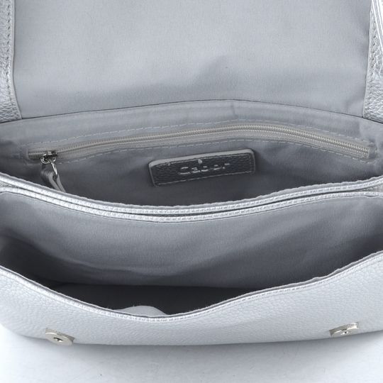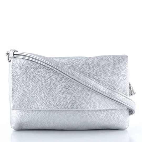 Malá crossbody kabelka s klopou a děleným vnitřním prostorem ve stříbrném metalickém provedení.