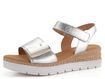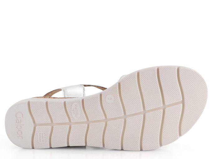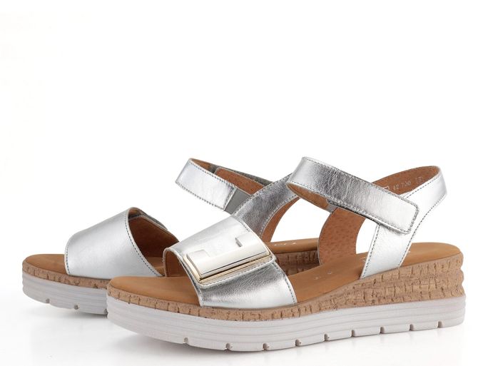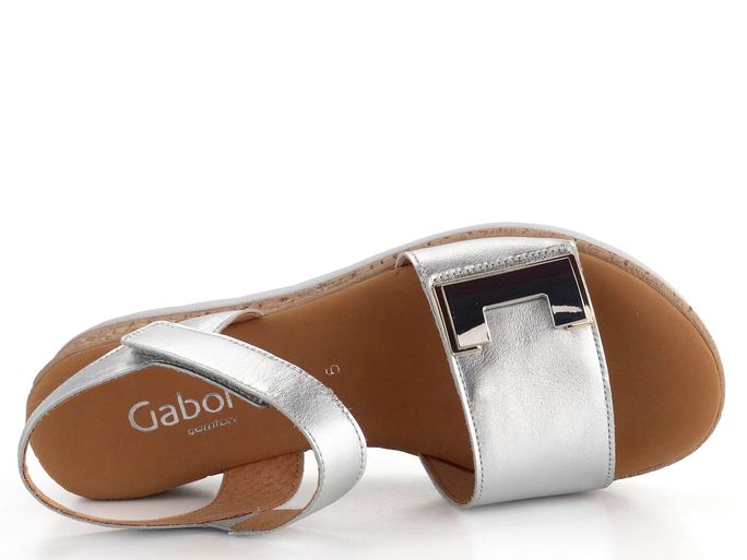 Velmi pohodlné a elegantní dámské sandály od značky Gabor vynikají svou praktičností a stylovým designem. Tyto sandály jsou vyrobeny z přirozeně strukturované metalické kůže ve stříbrné barvě, která je snadno kombinovatelná s různými outfity. Díky ozdobné kovové sponě a suchému zipu na předním i nártovém pásku je zajištěno snadné a rychlé obouvání. Nártový pásek je navíc vybaven gumičkou pro ještě vyšší pohodlí.