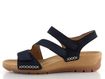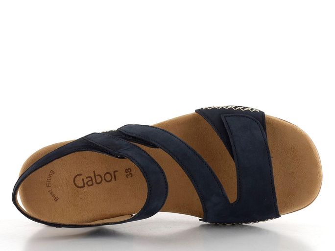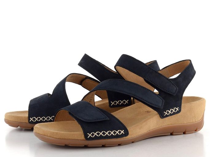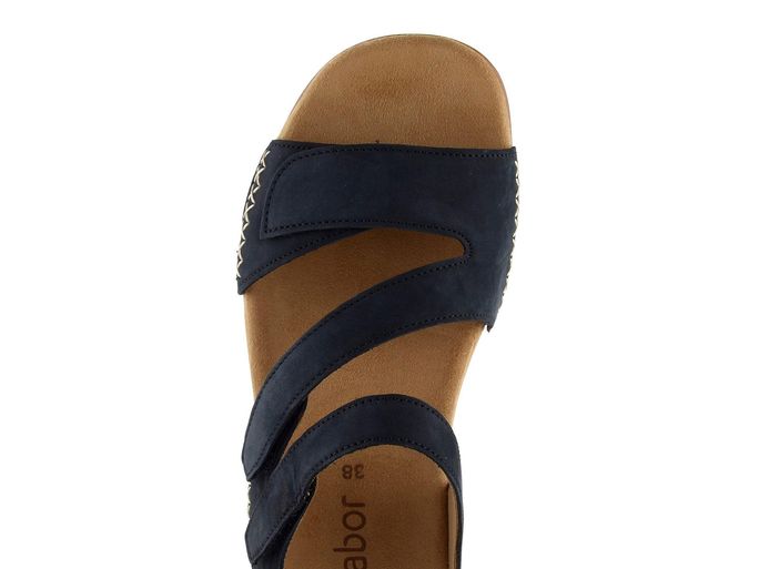 Dámské sandály na klínku od značky Gabor přinášejí komfort a styl v jednom. Tyto sandály jsou navrženy pro ženy, které hledají pohodlí a eleganci na každý den. Svršek z nubukové kůže v temně modré barvě je doplněn o kontrastní světlé štepování, což dodává botám jedinečný vzhled. Anatomicky tvarovaná stélka, potažená textilií, a flexibilní latexová podešev zajišťují měkký došlap a pohodlí po celý den. Praktické pásky na suchý zip umožňují snadné přizpůsobení a rychlé obutí. S výškou podpatku 4,5 cm jsou tyto sandály ideální volbou pro jarní a letní sezónu, ať už se chystáte do města nebo na lehkou procházku.