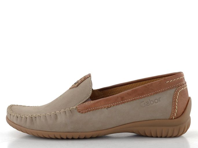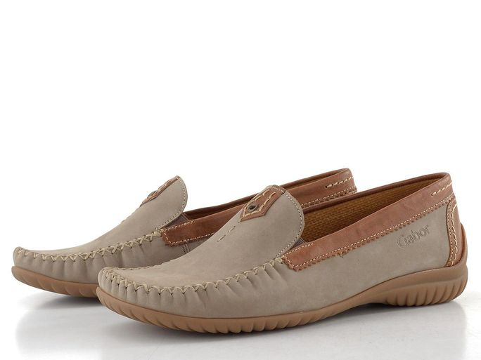 Luxusní dámské mokasíny od značky Gabor představují ideální volbu pro jarní a letní dny. Tyto boty v tmavě béžové barvě s lehkým šedým nádechem doplněné o světle hnědé detaily, skvěle padnou díky prostornému střihu. Svršek z pevné nubukové kůže a módně prošívaný lem špičky dodávají styl a eleganci. Pružné vsadky na nártu zajišťují snadné obouvání a komfortní nošení. Extra měkká kožená stélka s perforací a flexibilní latexová podešev poskytují potřebnou podporu a pohodlí při každém kroku. Tyto mokasíny jsou skvělou volbou pro každodenní nošení, do kanceláře nebo na lehké procházky.