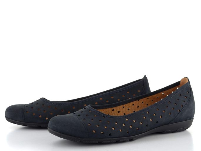 Dámské baleríny od značky Gabor představují ideální volbu pro jarní a letní dny. Tyto temně modré nubukové baleríny kombinují eleganci s maximálním komfortem. Svršek z kvalitní nubukové kůže je proříznutý do vzdušných čtverečků, což zajišťuje příjemné odvětrávání chodidel. Kulatá špička a měkká kožená stélka s perforací zaručují pohodlí i při celodenním nošení.