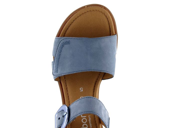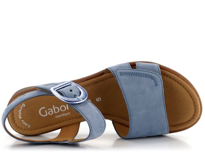 Dámské nubukové sandály značky Gabor vás zaujmou svým komfortním střihem a elegantním designem. Vyrobené z kvalitní nubukové kůže v světlé modrošedé barvě, která je doplněná metalickou sponou. Sandály mají kulatou špičku a široký přední pásek nastavitelný suchým zipem, což zajišťuje pohodlné nošení. Kotníkový pásek je rovněž upínaný na suchý zip a obsahuje pruženku pro lepší přizpůsobení. Textilní podšívka a měkká stélka potažená textilií přidávají na komfortu. Kvalitní a flexibilní latexová podešev se zvýšenou patou (2,7 cm) poskytuje potřebnou podporu. Ideální volba pro jarní a letní sezónu.
