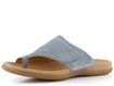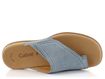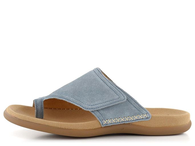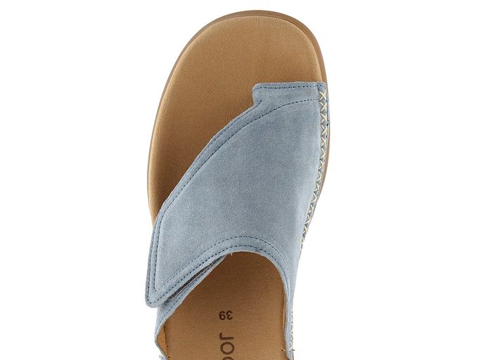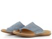 Dámské žabky ze semišové kůže ve světle modré barvě s plochým páskem mezi prsty a na pohodlné latexové podešvi.