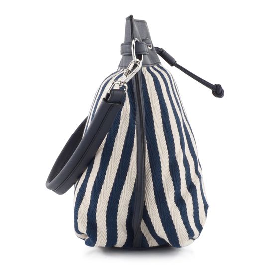 Luxusní dámská pruhovaná kabelka - vak z kombinace hladké syntetiky a pevné tkaniny.