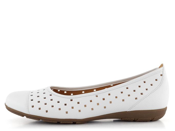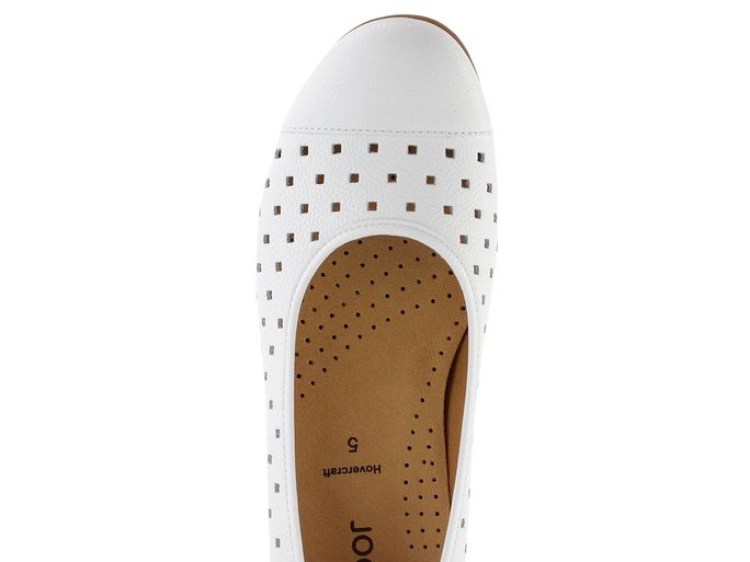 Zažijte komfort a styl s dámskými balerínami od značky Gabor. Tyto boty jsou ideální volbou pro jarní a letní sezónu, kdy se chcete cítit pohodlně a zároveň vypadat elegantně. Vysoce kvalitní kůže tvoří svršek bot, který je doplněn prořezávanými čtverečky pro lepší odvětrávání chodidla. Bílá barva dodává balerínám svěžest a univerzálnost. Vnitřní podšívka z kombinace textilie a kůže zajišťuje maximální pohodlí, zatímco měkká kožená stélka s perforací přispívá k příjemnému pocitu při nošení. Latexová podešev Hovercraft® nabízí dokonalé odpružení díky vzduchovým komorám, což oceníte při každém kroku.