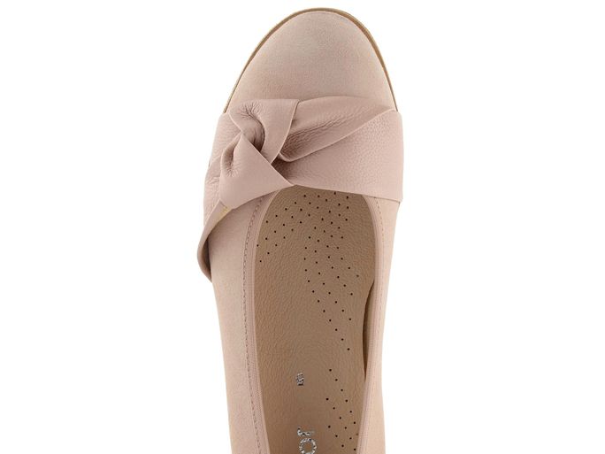 Dámské pudrově růžové baleríny s ozdobným uzlem, vnitřní měkkou koženou stélkou a komfortní hrubší podešví.
