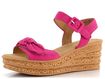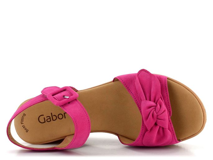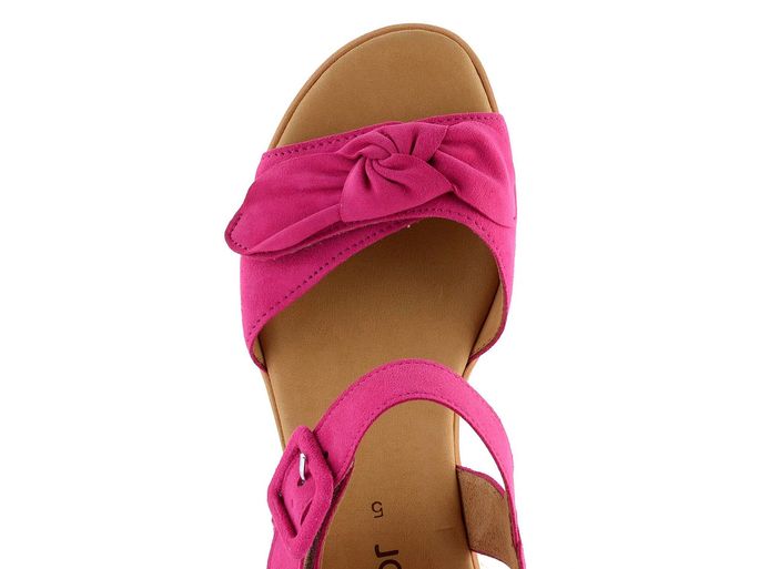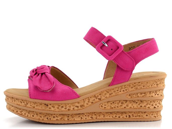 Elegantní a luxusní sandály od značky Gabor jsou ideální volbou pro ženy, které ocení kvalitu a styl. Tyto sandály jsou vyrobeny z jemné semišové kůže ve fuchsiově růžové barvě, která zaujme na první pohled. Díky prostornému kulatému střihu a měkké kožené stélce poskytují maximální komfort při nošení. Přední pásek zdobený mašlí a kotníkový pásek na suchý zip dodávají sandálům jedinečný vzhled a snadné upínání. Podšívka z hladké kůže zaručuje příjemný pocit na noze. Sandály mají vysokou platformu s klínkem a syntetickou podešev s jemným vzorkem, což zajišťuje stabilitu a pohodlí při chůzi. Výška podpatku je 7 cm, což dodává eleganci a prodlužuje nohy. Tyto sandály jsou skvělou volbou pro jarní a letní sezónu, ať už do města, do kanceláře nebo na lehkou procházku.