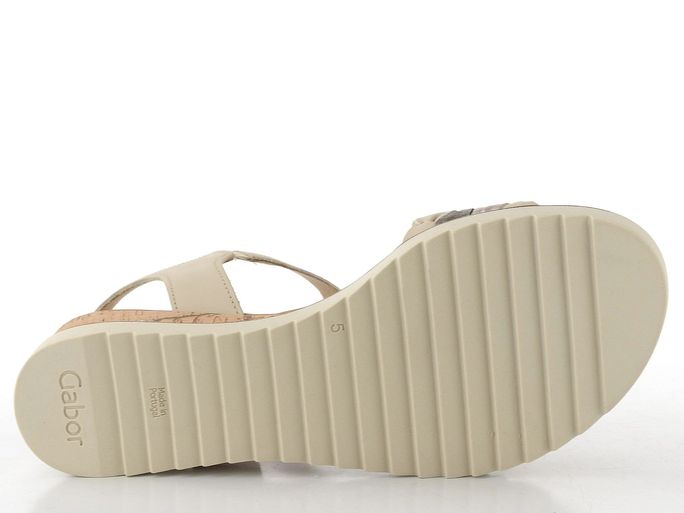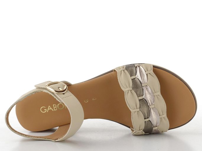 Kožené dámské sandály od značky Gabor představují ideální volbu pro jarní a letní dny. Tyto páskové boty v béžové barvě kombinují elegantní design s maximálním pohodlím. Vynikají kulatým střihem a jsou vyrobeny z hladké kůže, což zaručuje jejich dlouhou životnost. Přední pásek je zdoben provlékanými proužky v béžové, stříbrné a kovově šedé barvě, zatímco nártový pásek se snadno přizpůsobí díky suchému zipu a pružence.