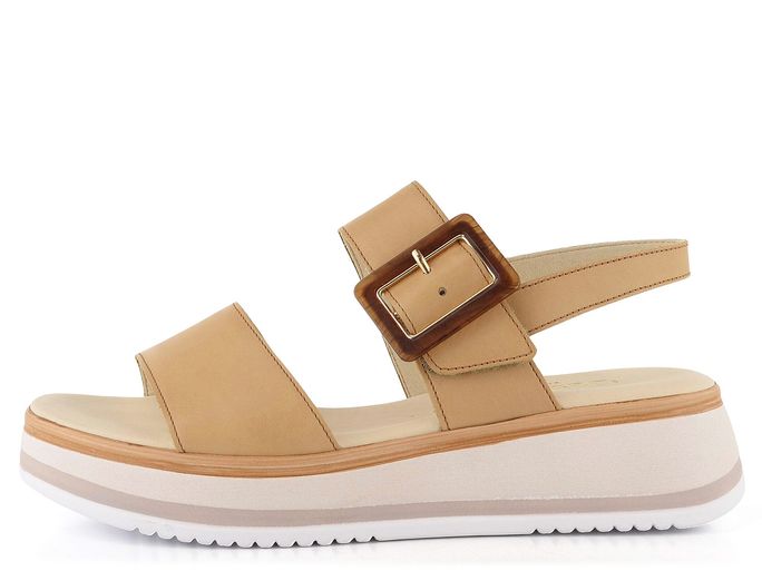 Vyzkoušejte pohodlné a stylové dámské sandály od značky Gabor, které jsou ideální volbou pro jarní a letní dny. Tyto sandály se vyznačují pohodlným střihem s kulatou špičkou a jsou vyrobeny z kvalitní hladké kůže ve světle hnědém odstínu (peanut). Nártový pásek je upínaný na suchý zip, což zajišťuje snadné a rychlé obutí, zatímco patní pásek se všitou pruženkou poskytuje stabilitu a pohodlí.