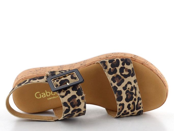 Pohodlí a styl se snoubí v těchto dámských sandálech značky Gabor. Vyrobené z kvalitní zabroušené kůže, tyto sandály s leopardím vzorem v béžových, hnědých a černých tónech dodají vašemu outfitu šmrnc. Kulatá špička a nártový pásek s regulací na suchý zip zaručují perfektní přizpůsobení. Patní pásek s pruženkou a měkká stélka přispívají k celodennímu komfortu. Vyšší platforma s korkovým dekorem a syntetická podešev s hrubším vzorkem zajišťují stabilitu a styl. Ideální pro jarní a letní dny, tyto sandály jsou skvělou volbou pro každou příležitost, ať už jdete do města nebo na lehkou procházku.