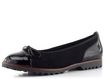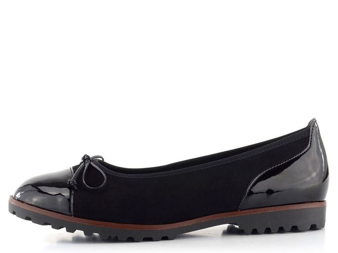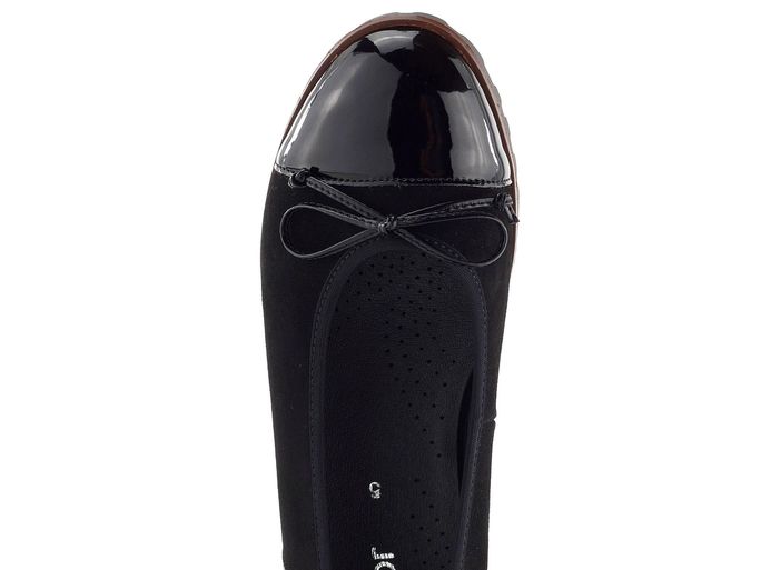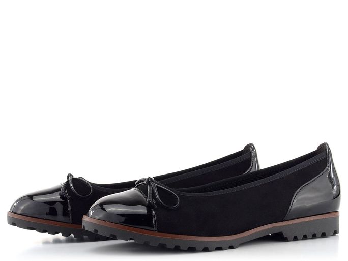 Dámské černé semišové baleríny s lakovanou špičkou, patou a pohodlnou hrubší podešví.
