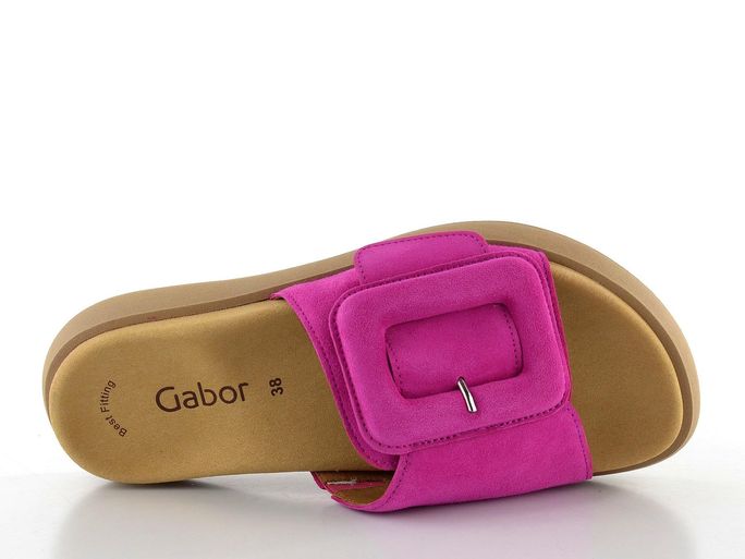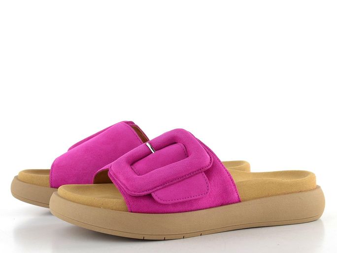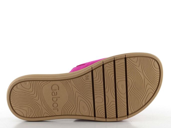 Vysoce komfortní pantofle značky Gabor jsou ideální volbou pro ty, kteří hledají stylový a pohodlný doplněk pro jarní a letní dny. Tyto pantofle vynikají svou fuchsiově růžovou barvou a jsou vyrobeny ze semišové kůže, což jim dodává luxusní vzhled. Špička kopíruje tvar prstů pro maximální komfort. Nártový pásek, který se upíná na suchý zip, zajišťuje optimální padnutí na nohu. Z vnitřní strany pásku je prostřih s pruženkou, který zvyšuje pohodlí. Anatomicky tvarovaná stélka potažená broušenou textilií a vyšší platforma s vysokým podílem latexu poskytují měkký došlap. Tyto pantofle jsou ideální volbou pro město i lehkou procházku.