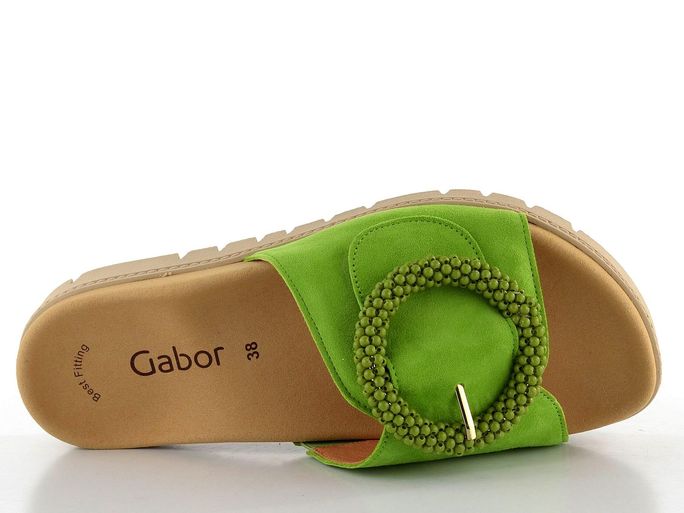 Představujeme vám vysoce komfortní pantofle značky Gabor, které kombinují styl a pohodlí. Tyto pantofle jsou vyrobeny z jemné semišové kůže v syté, jablíčkově zelené barvě, která zaujme na první pohled. Ozdobná spona opletená korálky dodává botám unikátní vzhled, zatímco pásek se upíná praktickým suchým zipem. Díky anatomicky tvarované stélce potažené broušenou textilií a zvýšené, flexibilní podešvi s vysokým podílem latexu si můžete užívat měkký došlap po celý den. Tyto pantofle jsou ideální volbou pro ženy, které hledají stylovou a pohodlnou obuv pro městské prostředí i lehké procházky.