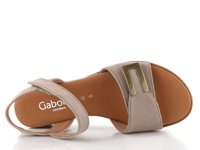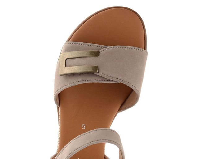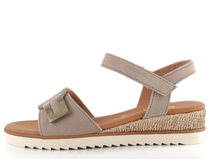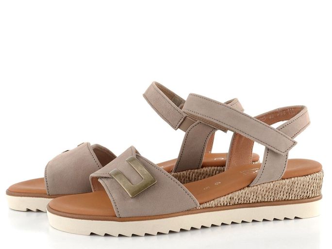 Představujeme béžové dámské sandály od značky Gabor, které jsou ideální volbou pro ty, kteří hledají styl a komfort v jednom. Tyto sandály se vyznačují semišovou kůží a ozdobnou kovovou sponou v mosazné barvě, která dodává elegantní vzhled. Pásky se upínají na suchý zip, což zajišťuje snadné a rychlé obutí. Měkká stélka z zabroušené kůže poskytuje pohodlí po celý den. Sandály mají mírný klínek opletený umělým lýkem a latexovou podešev s pilkovitým vzorkem pro lepší stabilitu. Perfektní pro jarní a letní dny ve městě i na lehkou procházku.