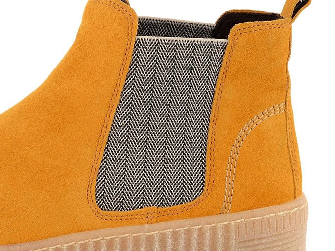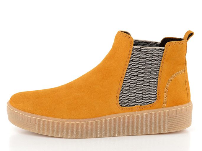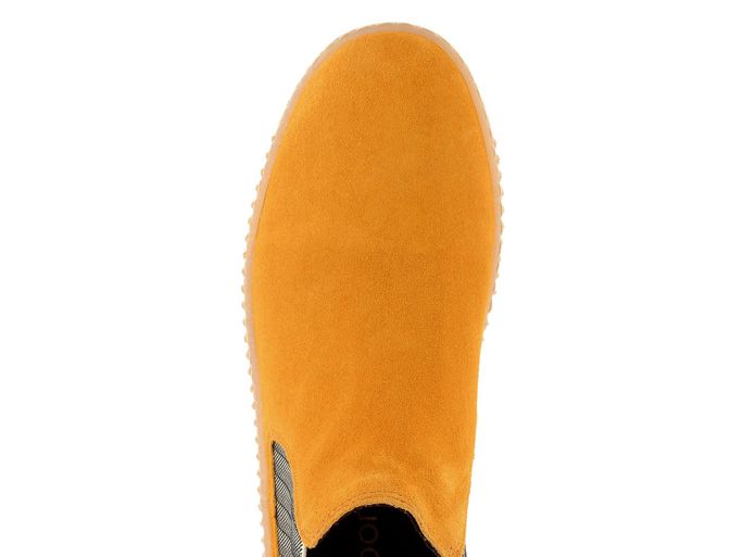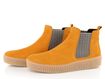 Dámský módní chelsea kotník ze semišové kůže v sytě žluté barvě se dvěma postranními širokými pružinkami.
