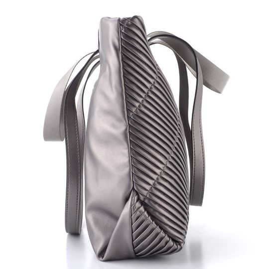 Dámská shopperka střední velikosti v metalickém provedení se vzorem na přední straně a madly do ruky i přes rameno.