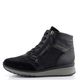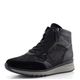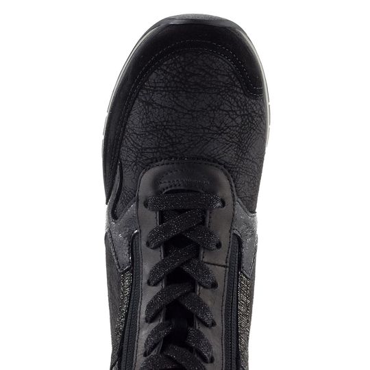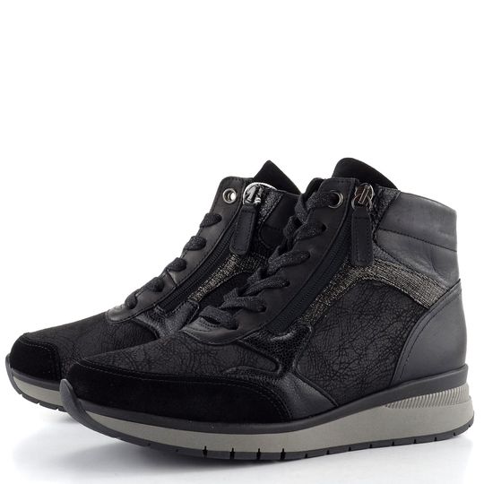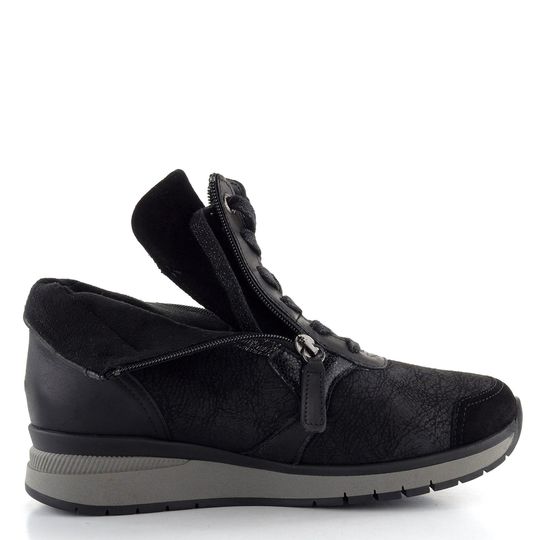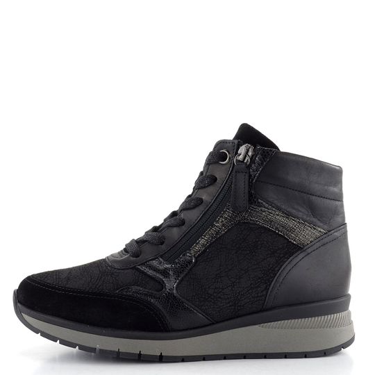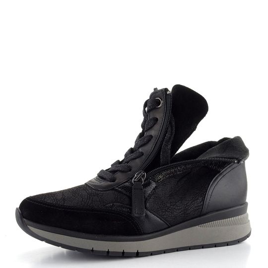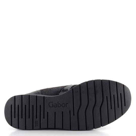 Dámské kotníkové boty značky Gabor v černé barvě se stříbrnými metalickými doplňky jsou ideální volbou pro podzimní a zimní sezónu. Tyto boty vynikají svou prostornou kulatou špičkou a extra šíří K, což je perfektní pro široká chodidla či haluxy. Svršek je vyroben z kvalitní kombinace hladké a semišové kůže spolu s pružnou strukturovanou syntetikou, což zajišťuje vysoký komfort. Boty disponují šněrováním se širokými tkaničkami protkanými stříbrnou lurexovou nitkou a dvěma praktickými postranními zipy pro snadné nazouvání. Vnitřní podšívka z broušené textilie a měkká vyjímatelná stélka s pěnovým základem poskytují maximální pohodlí. Vyšší latexová podešev se zvýšenou patou a výškou podpatku 4 cm dodává botám stabilitu a elegantní vzhled. Výška kotníku je cca 10,5 cm (bez podešve). Tyto kotníkové boty jsou nejen stylové, ale také velmi pohodlné a praktické pro každodenní nošení.