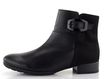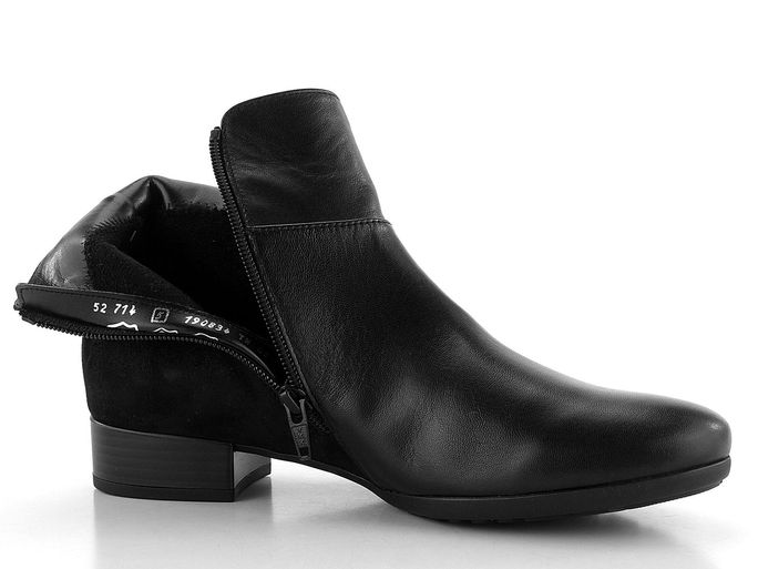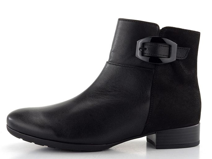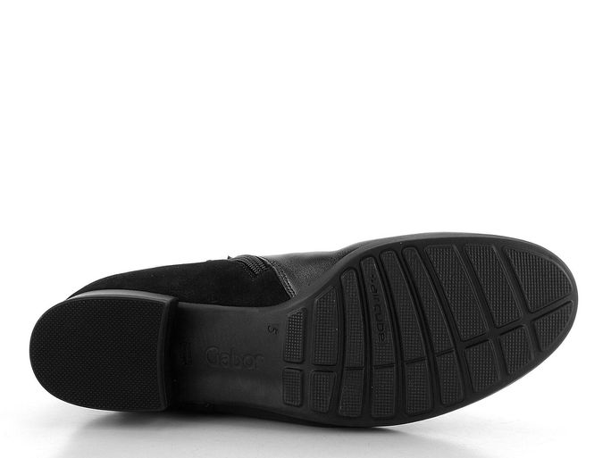 Značka Gabor přináší elegantní a pohodlné kotníkové boty určené pro ženy se širším chodidlem. Tyto boty vynikají prostornou kulatou špičkou a šířkou H, což je ideální pro širší nohu. Vyrobeny jsou z kombinace hladké a semišové kůže, přičemž semišová část paty má jemný lesk. Černá barva dodává botám nadčasovou eleganci. Na vnitřní straně je zip pro snadné obutí, zatímco vnější strana je zdobena sponou. Podšívka z mikrotextilie zajišťuje pohodlí, i když boty nejsou zateplené. Flexibilní latexová podešev se vzduchovými polštářky "Air Cube" a široký nízký podpatek (výška podpatku 2,9 cm) přispívají k celodennímu komfortu. Výška kotníku je 12,5 cm (bez podpatku). Tyto boty jsou ideální volbou pro podzimní a zimní sezónu.