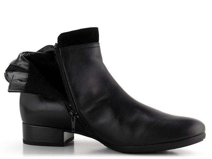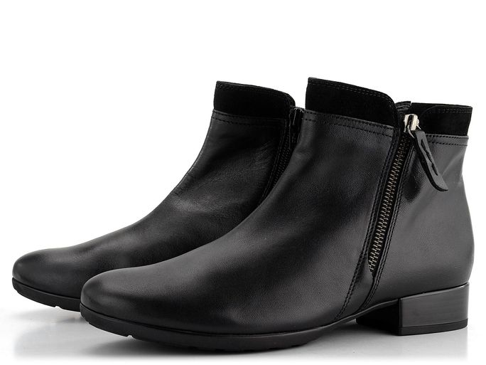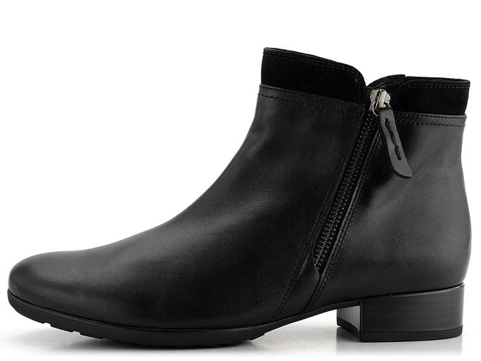 Pohodlný dámský kotník v širším střihu od značky Gabor je ideální volbou pro podzimní a zimní sezónu. Vyroben z kombinace černé hladké kůže a jemného semiše na horním lemu, tento model nabízí kulatou, prostornou špičku a je určen pro širší typ chodidla díky šíři H. Na vnějším boku najdete ozdobný zip, zatímco funkční postranní zip na vnitřní straně usnadní obutí. Uvnitř boty se nachází jemná vlasová textilie a příjemně měkká stélka, která zaručuje komfort při každém kroku. Kvalitní flexibilní podešev s hrubším vzorkem a nižší pohodlný a stabilní podpatek s protismykovým vzorkem na plátku patníku poskytují bezpečný a pohodlný krok. Tento lepený výrobní způsob zajišťuje dlouhou životnost a trvalou kvalitu.