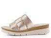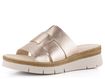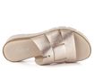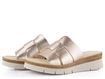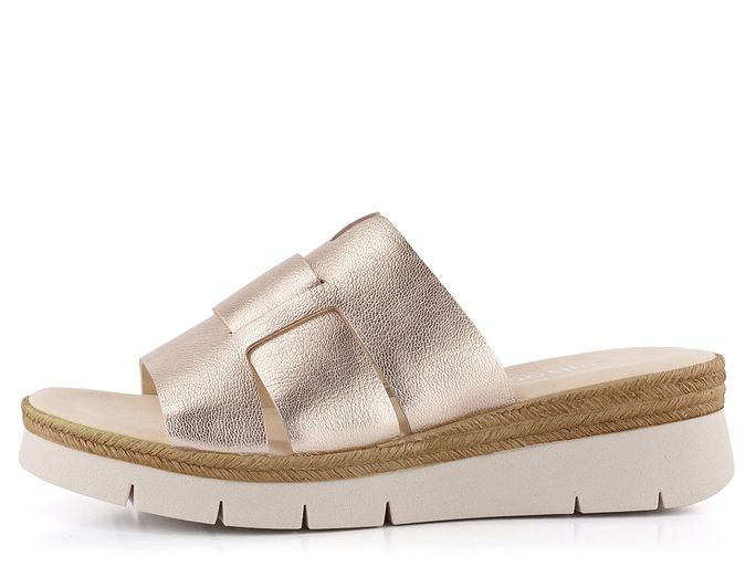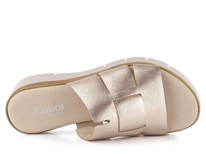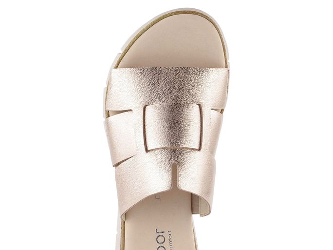 Luxusní širší dámské pantofle z metalické kůže v odstínu světlého zlata, na vyšší platformě s malým klínkem.