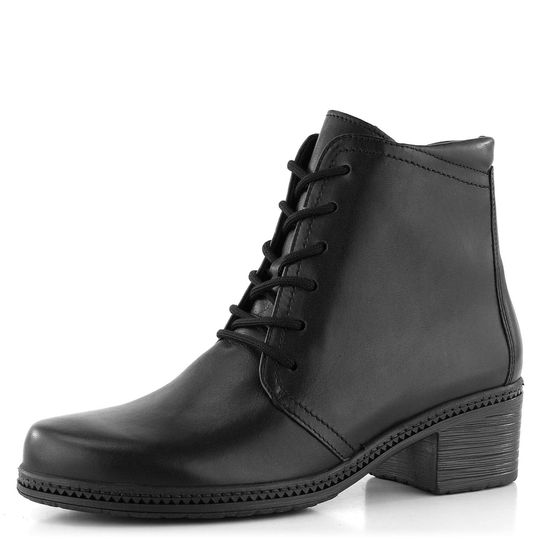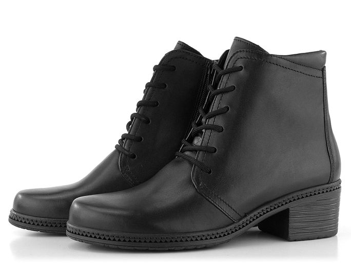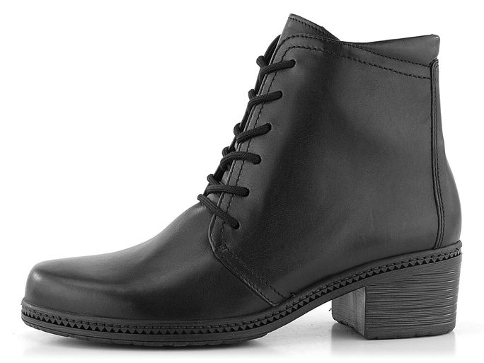 Dámský kožený šněrovací kotník v černé barvě, s teplou podšívkou a stabilním podpatkem.