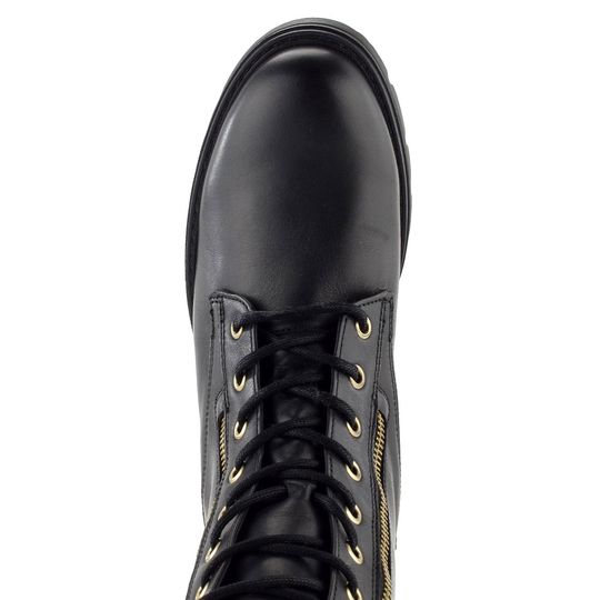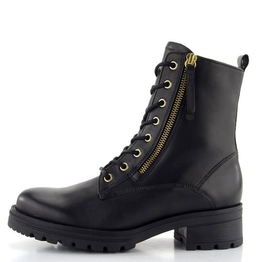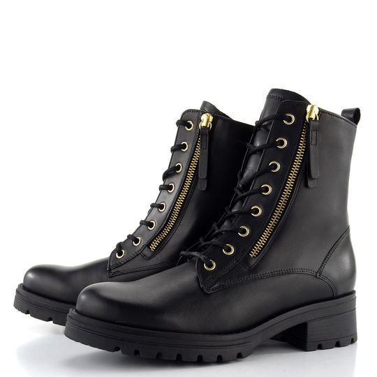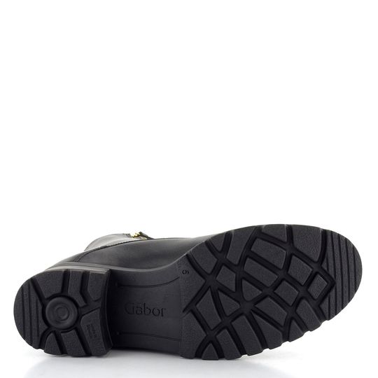 Dámský kožený kotník od značky Gabor je ideální volbou pro podzimní a zimní sezónu. Tento nadčasový model v černé barvě zaujme svým jednoduchým střihem s kulatou špičkou a elegantními kovovými doplňky ve zlaté barvě. Boty jsou vybaveny šněrováním s kovovými očky a kulatými tkanicemi, což zajišťuje pevné a pohodlné nošení. Díky funkčnímu zipu na obou stranách je obutí snadné a rychlé.