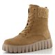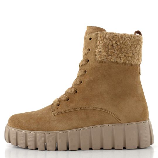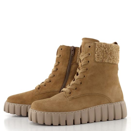 Dámský kotník na vysoké odlehčené platformě, s koženým svrškem a beránkovou bandáží.