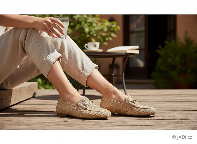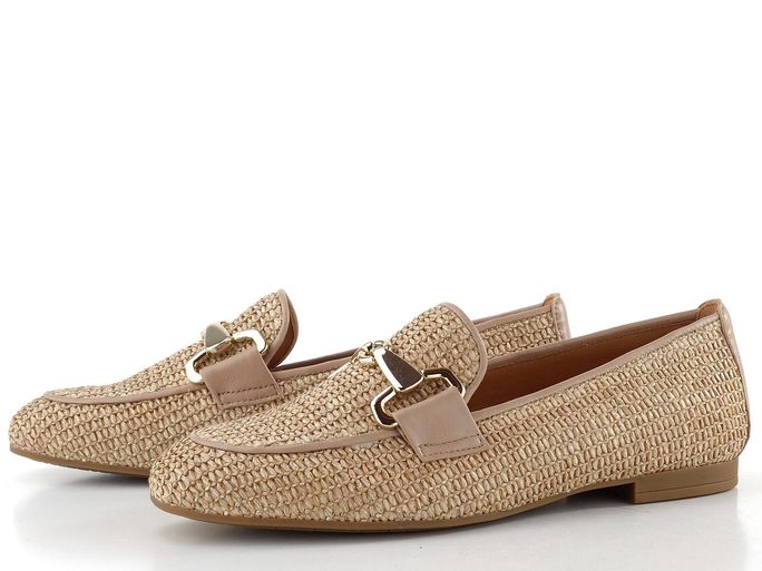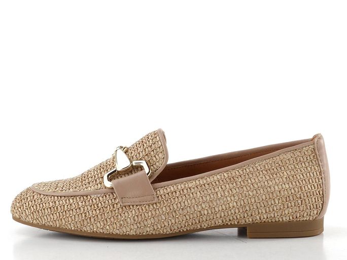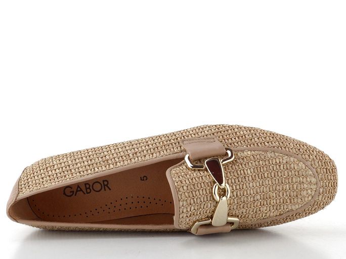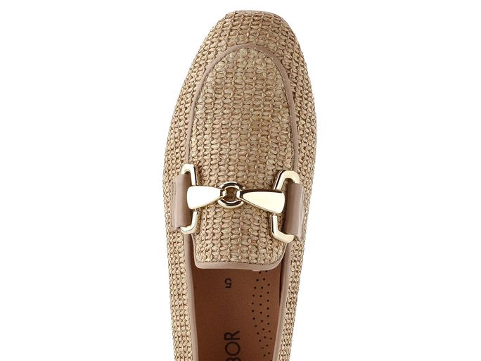 Pohodlí a elegance se snoubí v mokasínech značky Gabor, které jsou ideální volbou pro jarní a letní dny. Tento model, s módním mokasínovým střihem a užší kulatou špičkou, je navržen tak, aby skvěle padl na standardní i lehce užší typ chodidla. Kombinace hladké kůže a umělého splétaného lýka v přirozené béžové barvě dodává botám sofistikovaný vzhled, zatímco decentní kování ve světle zlaté barvě podtrhuje jejich eleganci.
