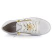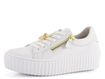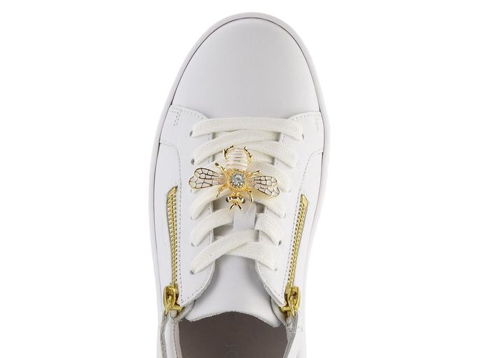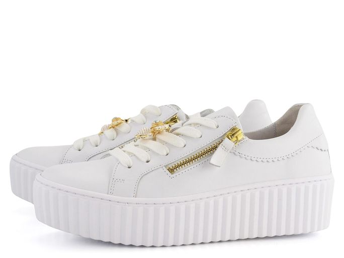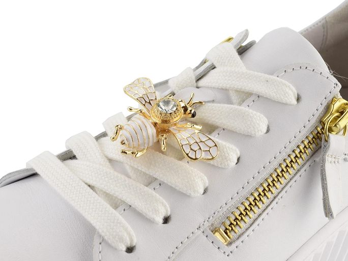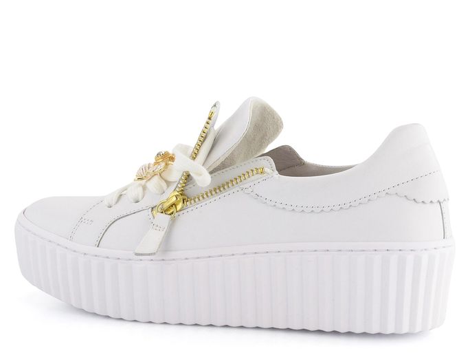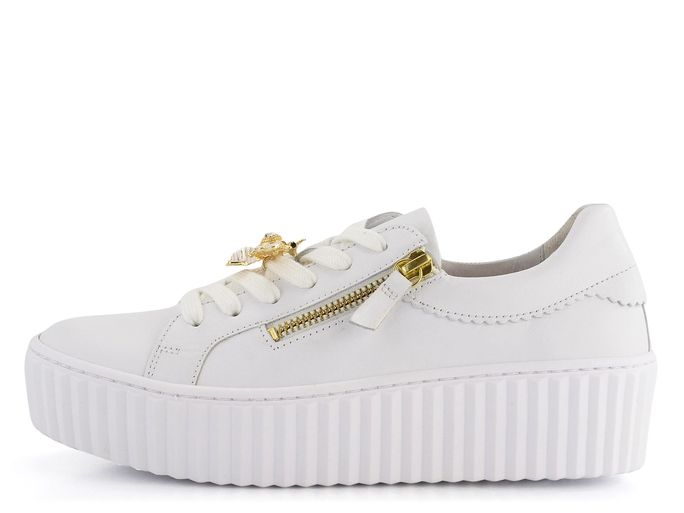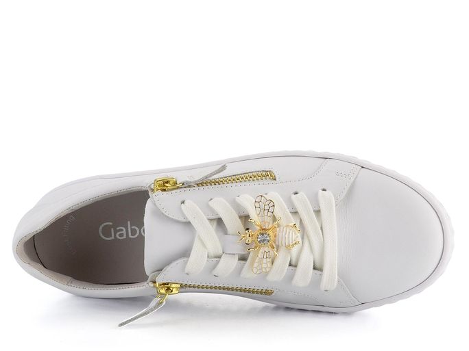 Dámské módní tenisky na vysoké platformě od značky Gabor jsou ideální volbou pro ty, kdo hledají styl a komfort. Tyto tenisky mají svršek z poddajné hladké kůže v elegantní bílé barvě, doplněný o kování ve zlaté barvě. Klasické šněrování je obohaceno o dva funkční zipy po stranách, což usnadňuje obouvání a zouvání. Na tkaničkách najdete krásnou kovovou brož ve tvaru čmeláka, která je vykládaná broušenými kamínky a dodává teniskám jedinečný vzhled.