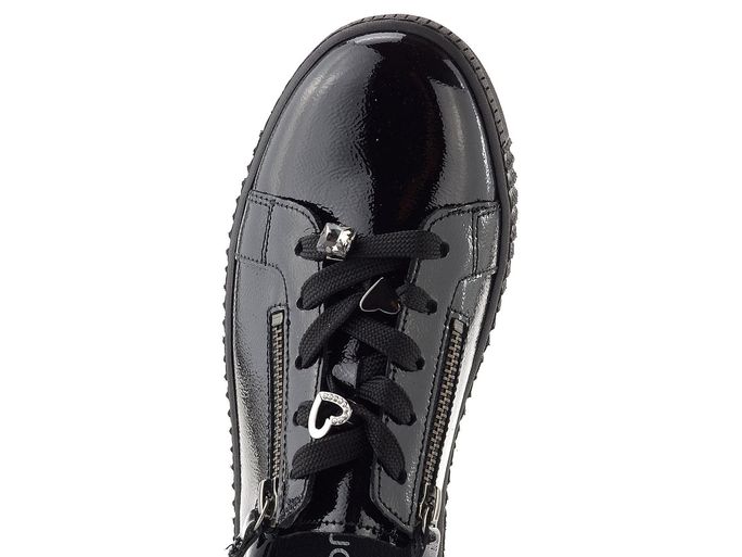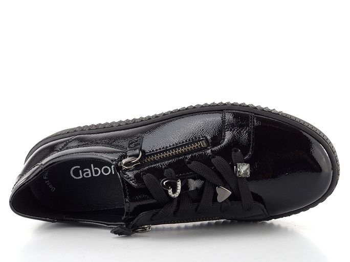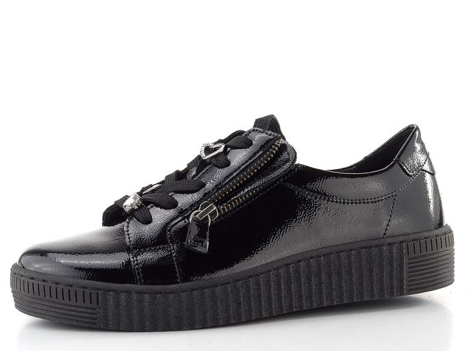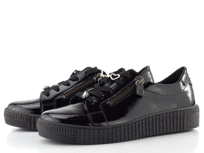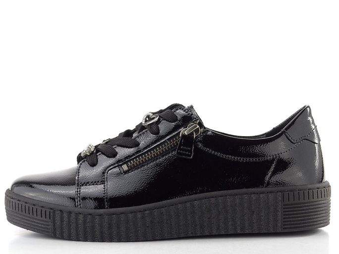 Dámské módní tenisky od značky Gabor přinášejí dokonalou kombinaci stylu a pohodlí. Jejich kulatý střih a svršek z pevnější lakované kůže v elegantní černé barvě dodává obuvi šmrnc a sofistikovanost. Kovové detaily ve stříbrné barvě a blyštivé ozdoby na tkaničkách podtrhují jedinečnost tohoto modelu.