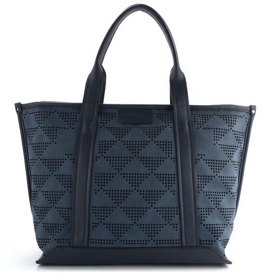 Prostorná dámská kabelka v tmavě modré barvě s celoplošným vzorem od značky Gabor je ideální volbou pro každodenní nošení. Díky své větší velikosti pojme i formát A4, což oceníte při pracovních schůzkách či nákupech. Vyrobena je z matné syntetiky, která je nejen odolná, ale i stylová. Prořezávaný vzor tvoří pravidelné trojúhelníky, které jsou podšité, čímž kabelka získává na eleganci.