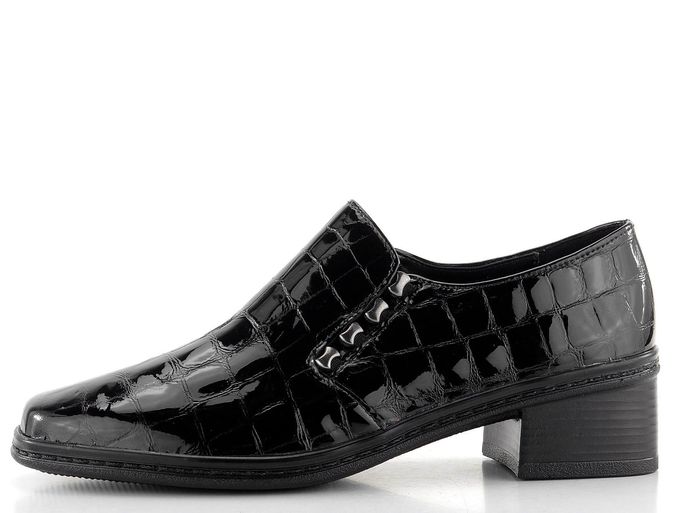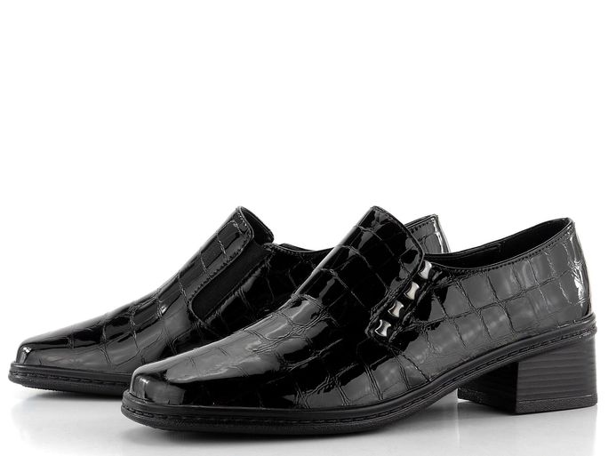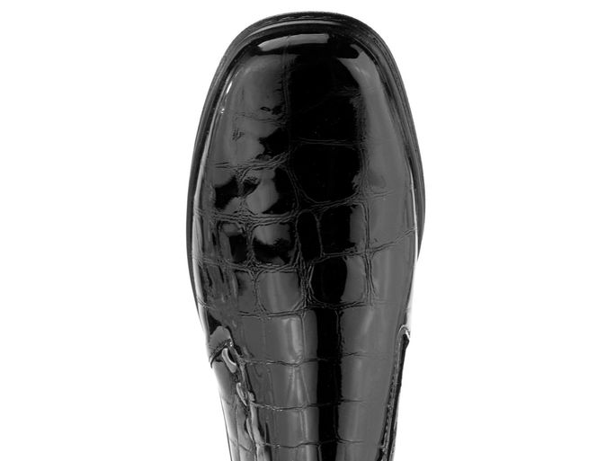 Dámské kožené polobotky v pohodlném střihu s lakovaným kroko vzorem a širokým stabilním podpatkem.