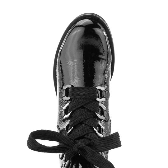 Nevšední dámský kotník v lakovaném provedení se zajímavými poutky na tkaničky.